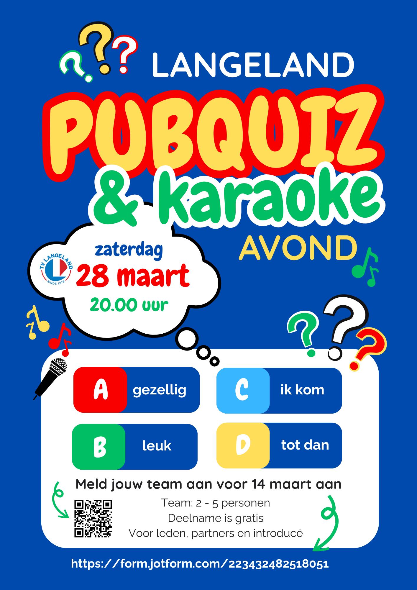 Doe jij (opnieuw) mee aan de Langeland Pubquiz? Dit keer kun je met een team meedoen op zaterdag 28 maart. We starten om 20.00 uur. Een team bestaat uit maximaal 5 mensen. Test jullie kennis en wie weet gaat jouw team er met de winst vandoor! Als je wilt, kun je na de quiz meedoen aan de karaoke. Om 24.00 uur sluiten we af.